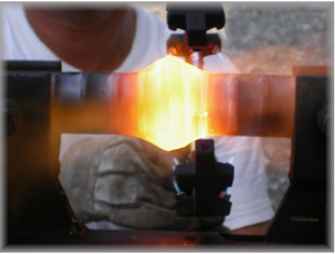 鉄筋端面にPSリングを挟みこんだ後、軸方向に圧力を加えながら突合せ部分を、酸素・天然ガス炎で加熱し、接合面を溶かすことなく赤熱状態にし、膨らませて接合する高分子天然圧接継手工法。